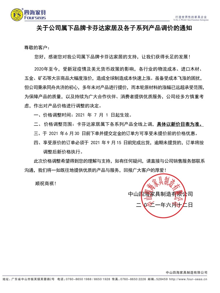 關(guān)于公司屬下品牌卡芬達(dá)家居及各子系列產(chǎn)品調(diào)價(jià)的通知