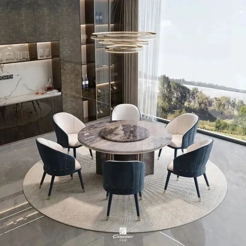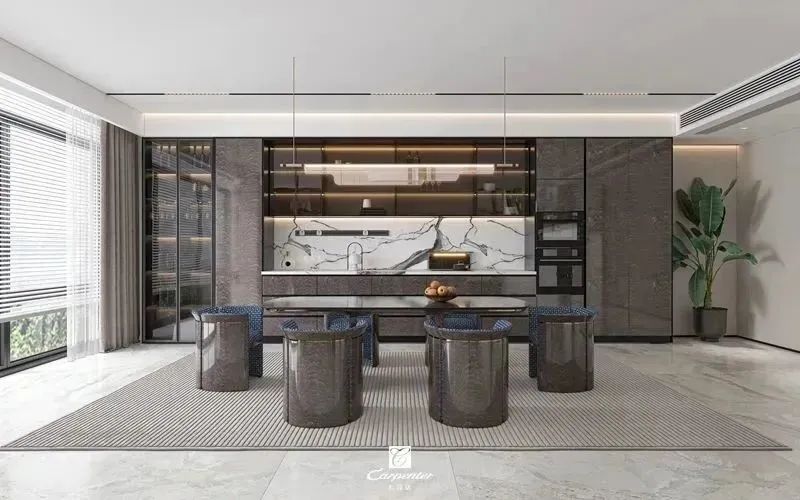 設(shè)計(jì)師通過材質(zhì)選擇、色彩運(yùn)用和軟裝搭配,演繹高級(jí)輕奢風(fēng)。注重空間與功能的結(jié)合,餐邊柜、酒柜及餐桌椅井然有序、整齊劃一,滿足用餐、收納、展示等多重需求。